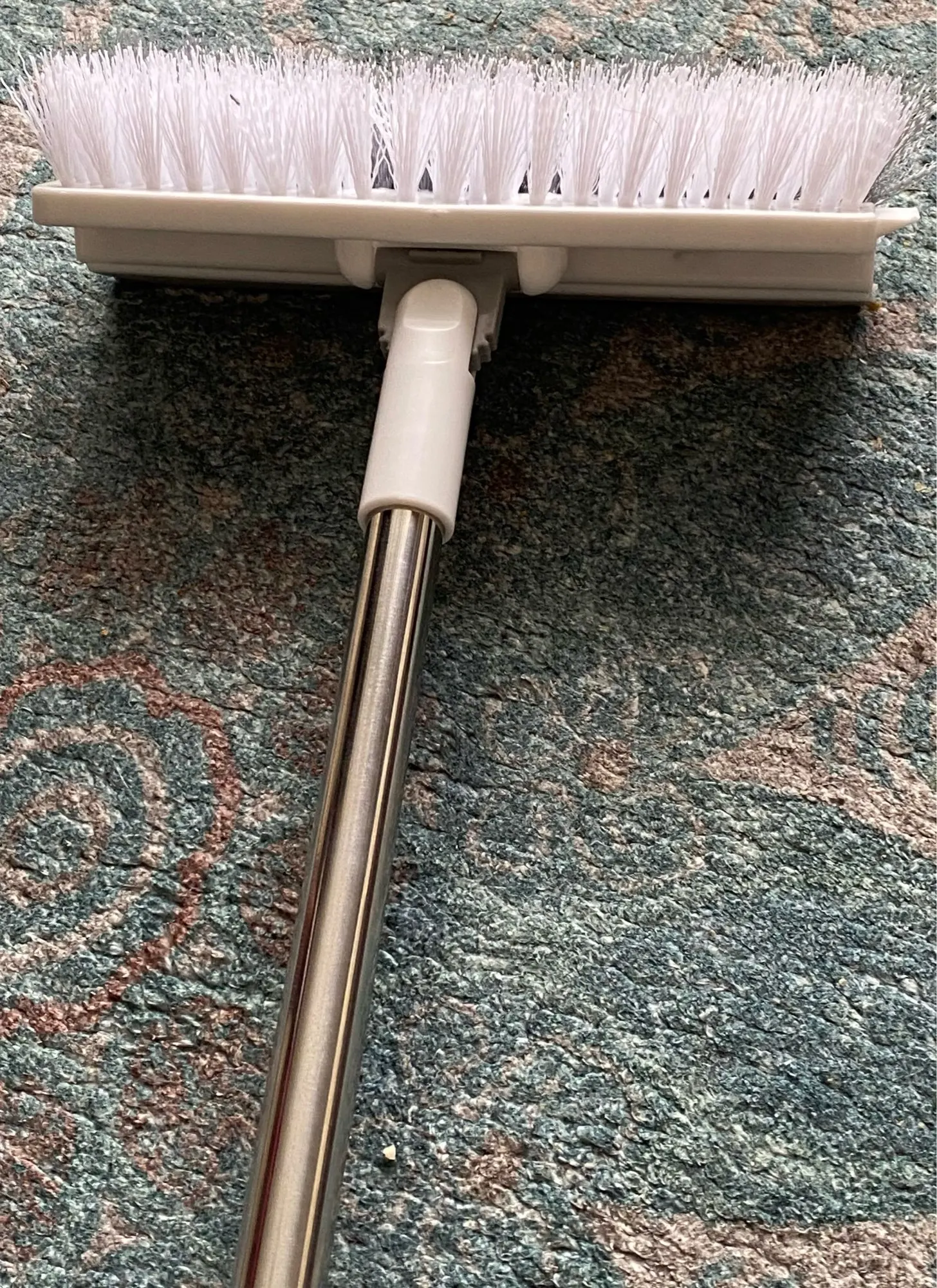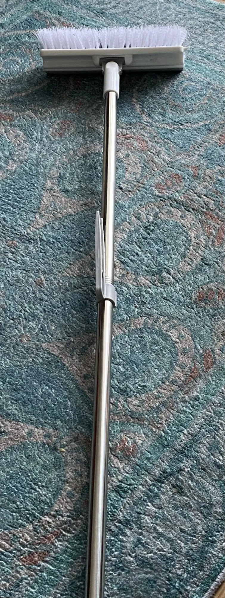 [【Improved 3-in-1 Floor Scrub Brush】ULTIMATE floor scrub brush! Combining a dual-sided scrub brush and a built-in scraper after brushing the floor you can easily scrap the sewage. Say goodbye to tough grime with ease thanks to the combination of tough bristles and a rubber squeegee. 【Right Angle Double-Sided Brush Head】180° rotatable and v-shaped head the scrub brush for floor angles perfectly to get into hard-to-reach areas or where the wall hits the floor. Double-sided design makes the grout brush effective for both wet and dry use. 【Firm Long Handle】Floor scrub brush comes with 2-section stainless steel rods thicker than others. The scrub brush handle length can be adjusted from 22" and 43". No more bending or straining—clean floors comfortably and efficiently. 【Ergonomic Design】45 degrees ergonomic angled design between the brush head and handle which easy to reach corners and gaps. The use of an extra-long handle also eliminates the need to bend over reducing the risk of back strain and injury. 【Premium Sturdy Material】With stiff and durable PVC bristles can get rid of stubborn dirt and stain effectively without scratching delicate surfaces while the high-quality rubber squeegee effectively clears away dirty water and 401 stainless steel handle is built to last. (Floor brush comes with a plastic clip that can be used to pick up hair and debris accumulated in the floor drain avoiding direct contact with dirt.)]